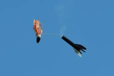 Mo' Skeeter  Flight It was a good flight, weathercocking somewhat, with an excellent deployment; the rocket drifted back over the launch area and landed in the grassy parking area with no evident damage. This is the 21st flight for this rocket, still wearing the same paint job (but with some small battle scars to ... [More]
