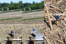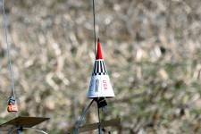 SCRAM 140  Flight It turned in a nearly perfect vertical flight before suffering a shock cord failure on deployment. The nose cone and streamer were not found, but the body did a perfect lawn dart maneuver, suffering minor damage. A new nose cone and some minor repair will have this one flying again. - A8-3 - ... [More]