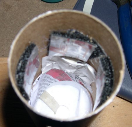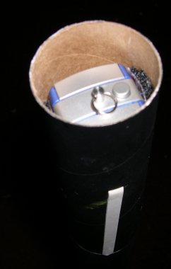 12. Now you must decide how you want to secure the camera. First I recommend taking a complete strip of estes wadding as it would come in the bundle from a wadding pack and insert this crumpled up into the plastic cup. This provides some cushioning and is non flammable just in the off chance some how a flame got through. You can use various fluffy filler material but the estes wadding will not burn in that 1 in a million chance that you might get a spark through. With the camera sitting on either the wadding ball or other fluff, you then need to take note how your camera fits in the tube and measure where the lens sits in relation to the outside of the payload tube. You will want to remove the camera and then using a very sharp exacto knife cut a square or round hole for the lens to see through. Once you have done this you will want to use felt pads or other material to brace the camera correctly so that it does not move. In my example I use squares of Velcro sandwiched together. This is shown below. I also have a U Shaped piece of paper inserted to keep the sticky glue from the Velcro pieces off of the camera. You may want to consider adding filler material inside the nose cone as well in case the camera comes loose. However, I think this is less of concern than the nose one coming off entirely. You may want to secure it in someway. The lens hole is to the right in the picture below.