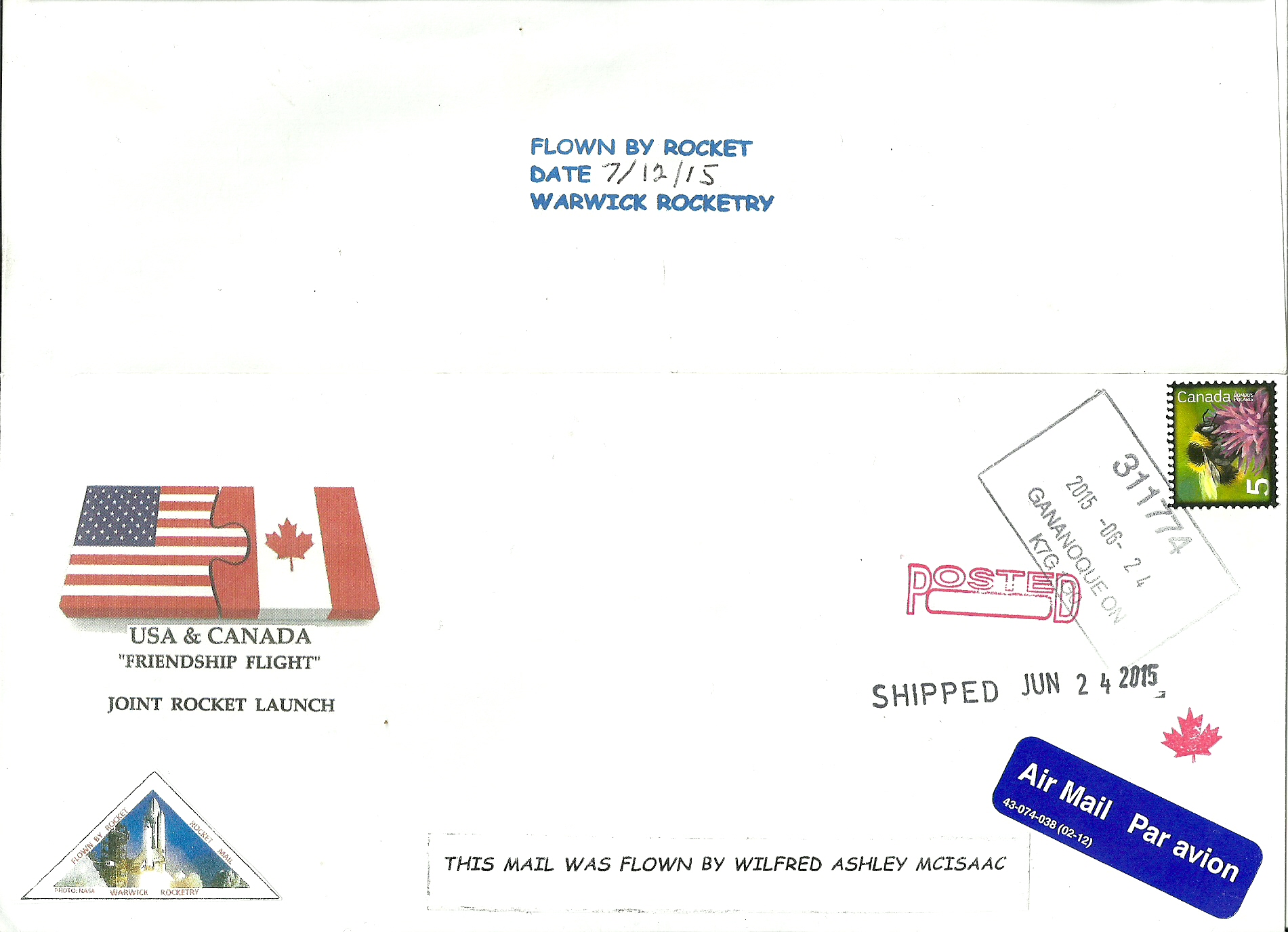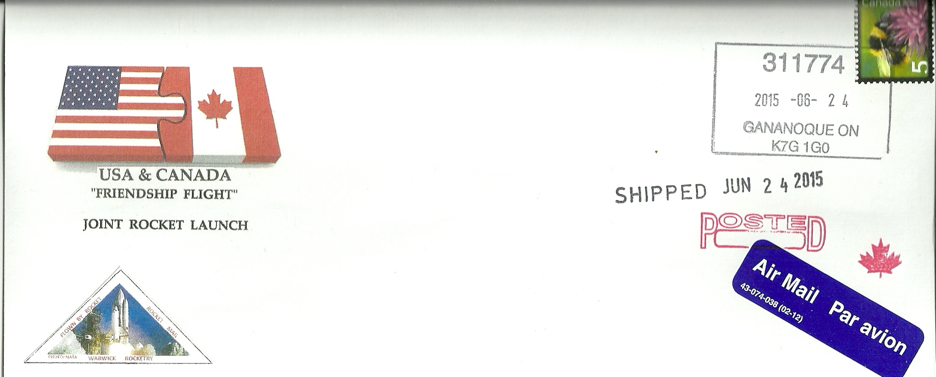 During the Canadian leg of the flight the rocket mail covers were cancelled at the Post Office in Gananoque Ontario.