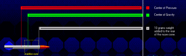 The initial problem came about when running the Stabilizer. Rockets 3 added 9 grams of Nose Cone weight to make it stable. RockSim with the B4-4 indicated marginal stability (with a Barrowman of 0.58). I added 9 grams of weight to the nose cone of the Alpha in RockSim and the new Barrowman stability went to 1.65.