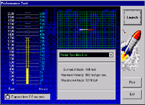 Screen ShotScreen ShotAfter stabilization, you are then allowed to go into a Performance Test. Again, another screen is opened and various voices and activities are heard as the rocket launches. You are then presented a graph that shows the altitude of the rocket with a solid bar for under thrust and an open bar for the coast time. The woman's voice will tell you when the recovery system is activated and then in my case, "flight successful". The altitude at burnout and maximum altitude are provided as well as the maximum velocity. This performance test can then be printed.