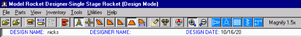 Screen ShotOnce you select your body tube then the Tube Length and Nose Cone tool buttons become "live" on the tool bar. By clicking the Tube Length button you can use a slider or type in the length of the tube. After that, then you should select the Nose Cone button. Doing so brings up a selection of nose cones that match your body tube diameter (in my case the BT50 gave 4 different BT50 nose cones). Again, you can add your own by clicking on the inventory button and entering the nose cone specs and giving it a name.