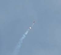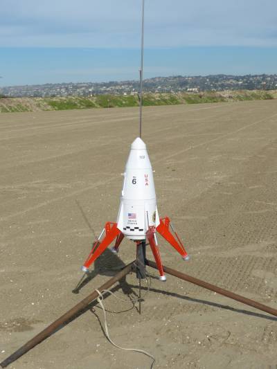 The chute deployed as expected and the long shock cord prevented any recontact of the nose cone with the rest of the rocket, a good thing since the heavy cone could do some real damage. Descent rate on the 48" chute was just a little fast (assuming an apogee of 600 feet, about 24 fps.) That stressed the landing gear at touchdown and several rubber bands snapped (on one leg I lost them all, but that could easily have been due to the rubber deteriorating), but there was no other damage (fortunately we fly on soft sand.)
