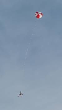 If you use a single parachute, I'm not sure how big it would have to be for a reasonable descent rate and still fit -- I may try the two-chute approach in the future. I'm sure something like a 36" Fruity Chutes Iris Ultra would work great, but it would cost more than the kit.