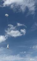 Very low level flight to about 150'. Parachute never unfurled and it landed within 10 feet of the pad on the edge of the dirt behind shortstop.
