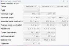 EasyMini readout from the flight. Slightly lower apogee than last flight due to arcing off the pad.