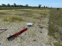 The J540 did its job and the rocket left the pad at about 60fps. Apogee was reported at 3558(gps) and 3405(RRC2L) for an average of 3481, or just about 80' short of the RockSim prediction. Not bad for a shakedown flight! Apogee charge fired as expected and the rocket descended at 51fps under drogue. The slight breeze (4mph) blew the rocket back over to the south side of the pads where the main unfurled at 700' and landed the rocket at a soft 21fps. Recover was easy, about 500' off the D pads.
