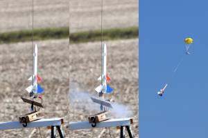 NOTE: This flight was a Quest (German) B6-0 to an Estes A8-5. The site seems unable to handle that. DESCRIPTION: It was not a good flight. The booster ignited just fine, and the boost was good up to staging altitude, whereupon it blew the guts out of the booster engine without separating the booster. The rocket recovered under chute well out in the field, but the interior of the booster is roasted beyond repair even though the paint job still looks good.