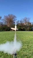 Flight #2112 for me, so someone suggested that a Canaroc bird would be a fitting flier. A8-3 flight that should have been a B6-4, but I chickened out just before I left the house. Flight was straight and stable, topping out around 150' and coming back almost to the rocket tote thanks to a parawad chute. "What can this strange device be?"