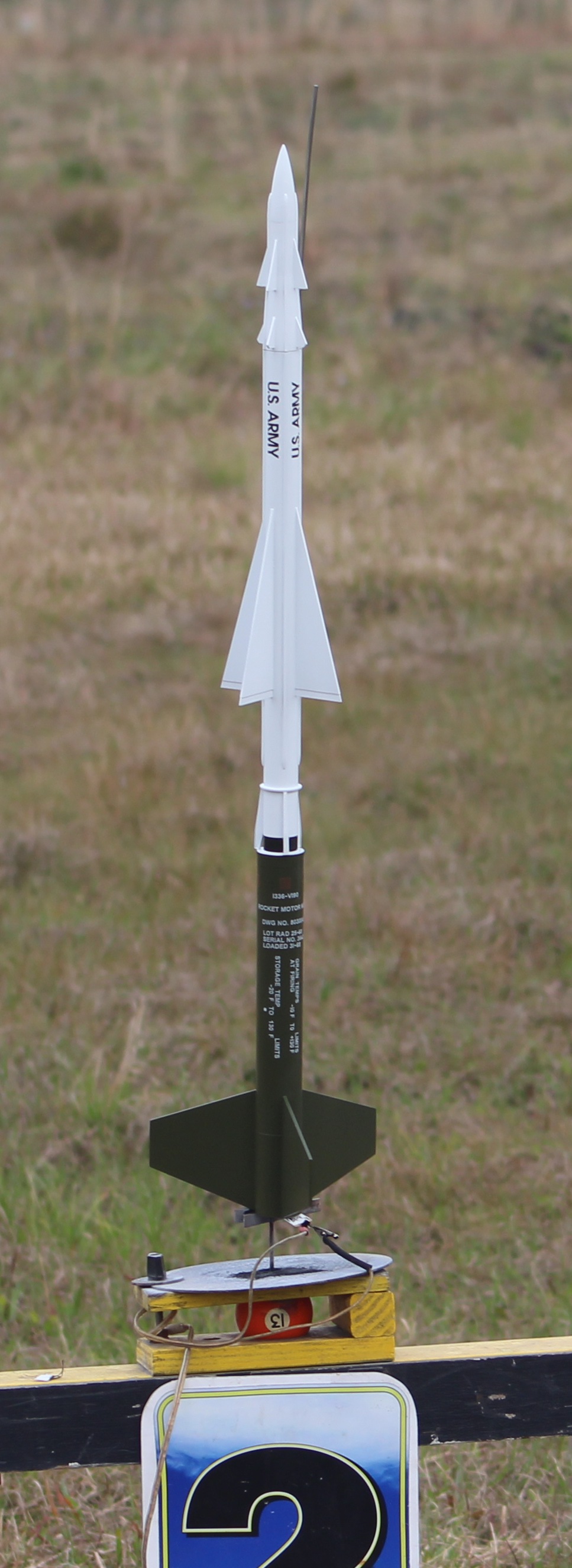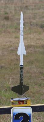 The B6-4 got it to 325'. At ejection, the new elastic shock cord burned through! The nose section came down under chute, the long body spun and fell horizontally.