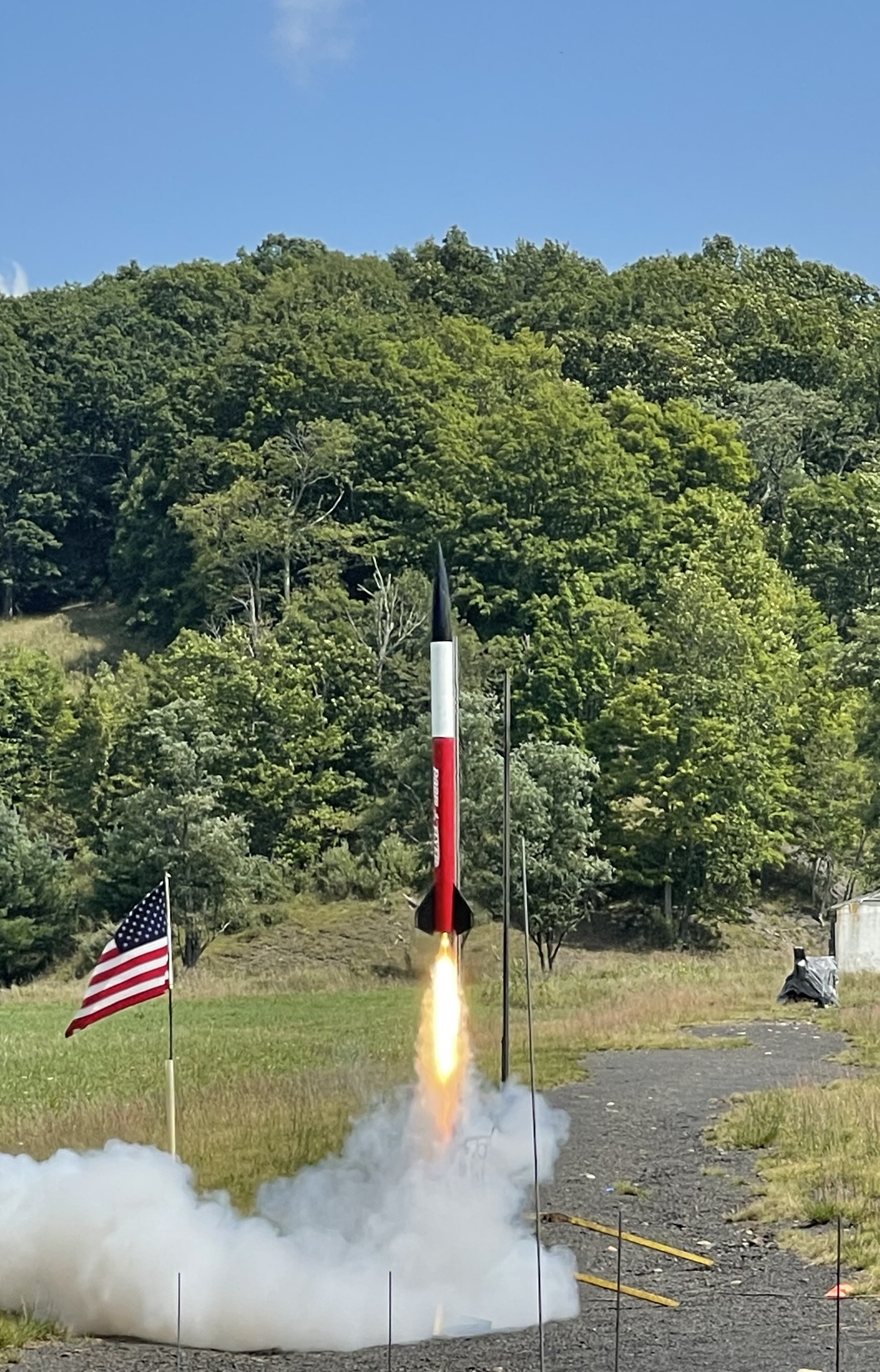 Drogue shear pins eliminated. Main shear pin holes reinforced with copper shim stock. Hole in nosecone taped to reduce volume to pressurize. Beeper eliminated because unable to initialize after multiple attempts. Some weather-cocking, probably due to relatively low speed off-the-rail. Straight flight. Both drogue charges fired on schedule; separation occurred, but drogue did not deploy because it was anchored too close to the body tube. Both main charges fired on schedule; main chute deployed perfectly. No damage.