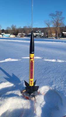 Beautiful and fun flight! I added a bit of clay to the nose so that it's more likely to point down when spinning. Probably also helped to keep the nose from drifting too far away (it sure hovered for a long time). The plastic fin can on the bottom is great for snow launches!