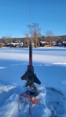 Beautiful flight... boost up looked amazing! Ejection charge was very loud and shot the nose cone off the body. Body came down in a flat spin and landed in soft snow without any damage.