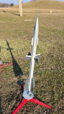 Rocket wind cocked which isn't surprising given all the fins. However, I added enough nose weight that the flight was stable. Stripped all but one shroud line so basically a streamer recovery. I should have known better than to use a plastic parachute with a composite motor.