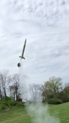 Uh, oops. I think something caught at liftoff. AstroSat took the whole launch rod with it as it left the, uh, tripod. Crashed to the ground about ten feet to my right. Er, back. I don't know. It was ugly. Broke a fin and a launch lug.