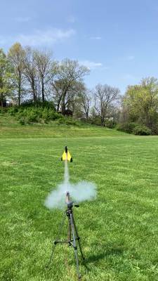 Left the pad heading extreme right and looked like it was going to be in danger of either sailing off toward the buildings across the road or landing on the softball field, but at ejection it reversed course and headed back across the field. Perfect glide across the outfield and landed when the airspeed dropped too much to keep the nose cone up. Awesome flight