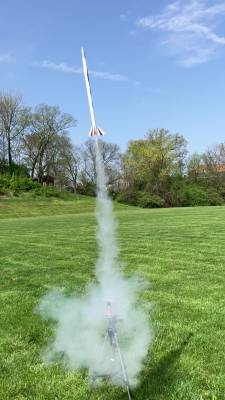 This is the perfect B6-4 rocket for B6-4 Field. Should have been a perfect flight, and all done over the field. Straight off the pad to 267' and an ejection at apogee, but no chute. It landed in the grass so no damage. As I was walking to the landing site, I noticed something red in the grass. It was the parachute, still packed up, but untied at the end where it had attached to the snap swivel.
