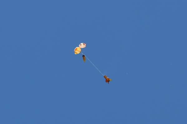 Rather than putting in a single large parachute I rigged it with both of the chutes I had that problem with on the second rack. using a bunch of crepe paper wadding. I used the old pyrogen Estes igniters, installing them with plugs before removing the paper and twisting them together with my range box pliers. I put in tiny pieces of masking tape in strategic locations to prevent shorting, and checked it all over several times before hauling it to the LCO. At his instructions I set it up on pad 4, from which spot it launched with authority. It was then that I started breathing again, as no amount of preparation will convince me that the igniters are correctly rigged until the engines all fire. It flew straight and surprisingly high, and deployed the twin chutes perfectly. It was recovered in undamaged condition north and west of the launch area and will absolutely fly again.