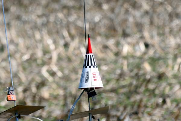 This one is challenging to set up for launch due to how far up into the conical body the engine goes; it's hard to get the clips on it. But I managed it, and it turned in a catalog-perfect, straight vertical flight. It's not a pretty rocket on recovery though, and between that and the difficulty rigging it I may not choose to fly it again.