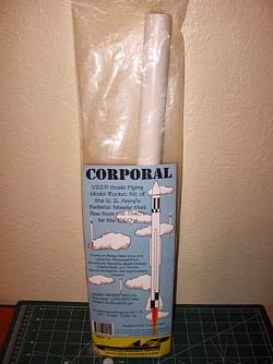 Brief: Aerospace Specialty Products (ASP) scale rocket kit "The Corporal". It is a interesting and fun build. It is the 24mm version and is a 1:22.5 scale version of the U.S. Army's Ballistic Missile. Construction: The parts included with the kit are: 1 Balsa nose cone (surprisingly clean no fuzz) 1 Balsa nose block 2 body tubes (main and nose) 4 ...