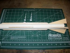 FinsNext, I had to cut out the fins. ASP gives you a template so that you can outline the fin pattern on the supplied basswood and then using a straight edge and an X-ACTO blade you can easily cut the four fins required for the Corporal. Once all the fins were cut out I then stacked them all together and sanded them so that each one was exactly the same.
