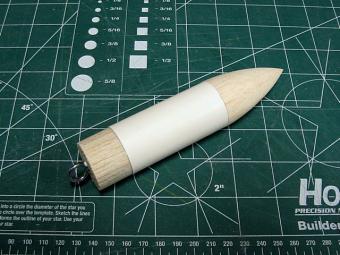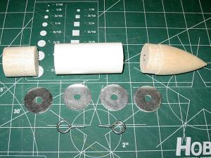 I then moved on to the nose cone section. This section comprised a specially shaped balsa nose cone, a small section of body tube, a balsa coupler, two eye-bolts, and four washers for nose weight. Due to the design of this kit a substantial amount of nose weight needs to be added to insure a safe flight.