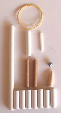 The only snag came when fitting the nose cone to the shorter body tube. The shoulder of the nose cone required some minor trimming to fit inside the body tube. The shock cord is threaded through the second coupler and tied to the lead weight. The lead weight and coupler are glued inside the short body tube. The streamer is attached to the shock cord with Scotch tape.