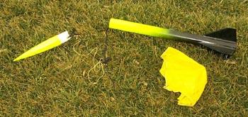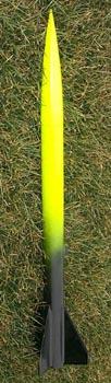 Finish:  A simple finish was put on this rocket. The nose cone seam was sanded smooth, and the whole rocket given a good once over with sandpaper to give the paint some "tooth." A light coat of white primer was laid down, and sanded lightly with 400-grit paper. I didn't take the time to fill the spirals, they are noticeable if you look for them, but the tubing has a fine enough spiral that it doesn't stand out. I then laid down two coats of Rustoleum Fluorescent Yellow on the forward section of the rocket. I followed that about an hour later with flat black on the after end feathering the paint above the fins. I didn't intend to mist quite so high, but it sort of snuck up there when I went to even it out, then I had to even out the "evening out", etc. After curing for a day or two I misted the entire thing with Rustolem gloss clear coat, and applied a "wet" coat of clear an hour or so later.