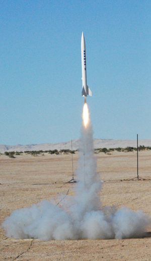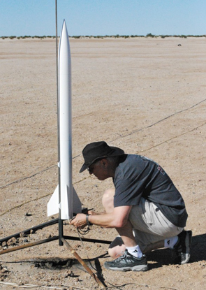 So, since I was succesful on the test flight with the G77, I decided to put a small H motor in it and do my Level 1 Tripoli certification flight. I put an H128 but the motor reload kit had the medium, or 10 second delay. rockSim said I needed a 6-7 second delay, so I drilled out a bit of the delay during assembly. The H128 worked as sim'd and went about 850' with the ejection once again right at the top of a very straight, no-roll flight. Level 1 accomplished! The booster hit on the hard-pack desert road and worstened the crinkle, so I definitely need to add something there or go to my 58" chute, or both.