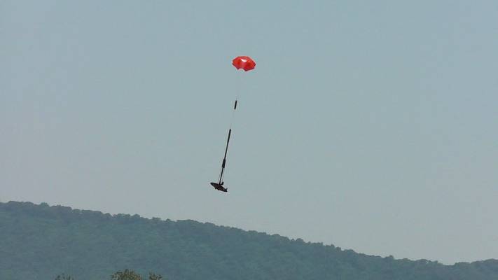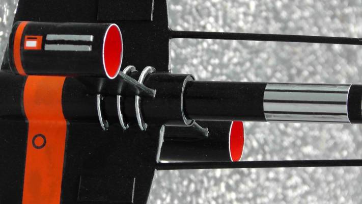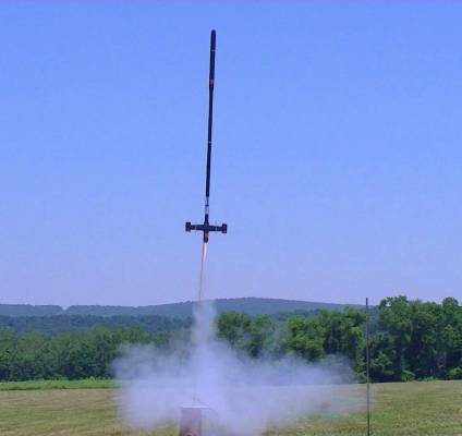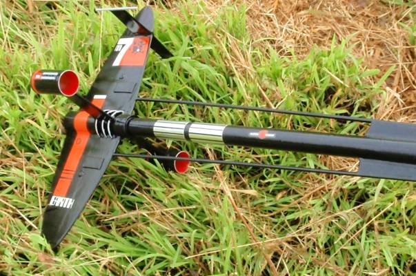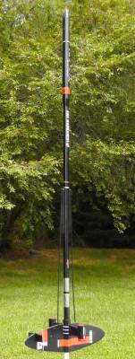 The Andromeda: This is the original Estes 1977 kit. It was started in 1977 but not finished until 2011! I have added an Iris altimeter payload bay when I completed it. During initial string stability tests, the rocket buckled and folded in half! To repair, about 2 inches were cut from body tube, so even with the 3 inches of altimeter bay; this rocket is only 1.3 inches longer than the standard model. The two sections are now joined by a coupler; which makes for easier transporting by separating the two halves. To prevent losing the lower half if it ever separates during recovery, I attached a small Kevlar cord between the two halves. It needed about 19grams of nose-weight to pass string-test, but flies straight up under moderate winds. This model got a lot of oohs and ahhs at the launch, as nobody else in the local club has one. To me, gloss black seems to look nicer than the recommended flat black. To that I added a small amount of silver trim, around the engine rings, the rectangles on the engine pods, the antennas, and some rings around the body tube ends. This model takes off fairly slow and majestically. With its large fins, I wouldn't want to fly this in stronger winds, as the weather-cocking could produce a near lawn dart, and its length would almost guarantee a folded body tube and fractured fins. This rocket has flown higher than the US Capitol building in Washington DC, and the Flatiron Building in NY.