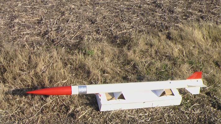 ARCAS mail rocket on launch pad at Gananoque aerodrome.