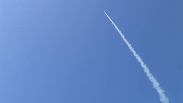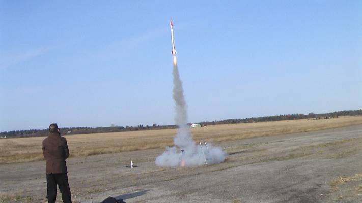 The ARCAS high powered rocket lifts off from launch pad in Gananoque, Ontario carrying rocket mail in Canada.