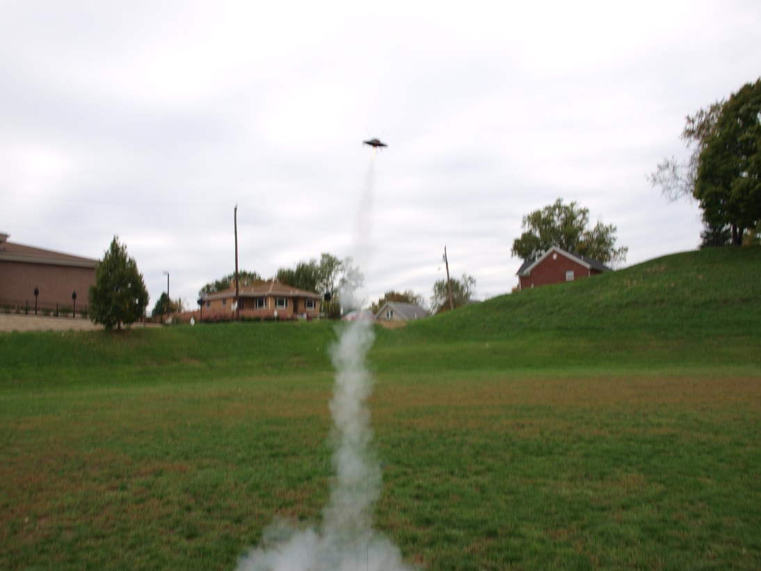 When I was a kid, the neighbors had a little contraption that let you load a ball into it and step on a pedal to toss the ball straight up about 8 feet. It was just enough time to get the oversized bat cocked and ready to wallop the ball into the next county. This flight reminded me a lot of that one, but I'd left the oversized bat at home. The UFO cleared the rod with some difficulty and flopped to the ground where the ejection charge fired after a second or two. Lots of smoke and flame, and best of all, I got the whole flight on camera without having to move.