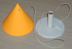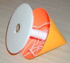 The instructions have you build the two sections of the Cone UFO. First you cut out the nose cone from the cardstock. This is then formed and glued. This is actually an inner support structure verse what we think of as traditional nose cones. A unique support method for this paper rocket. This nose cone takes all the ejection abuse. It also provided the nose weight needed for stability. Once the cone is formed it is filled to a described level with 5-minute epoxy. The inside is also coated with epoxy to strengthen it. Then after cutting out the nose cone base from the 1/4" foam board and using JUST the 19mm tube, the remainder of the nose cone is assembled. The shockcord is also attached here between the 19mm tube and the foam board base.