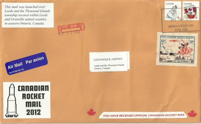 My Astrobee D high-powered rocket was launched from an old airfield in eastern Ontario on May 11th, 2012. The 3.25 pound (1.47 kg) rocket carried an advanced electronics package which included my own 'air intake unit' that performed flawlessly. Also inside the payload was five pieces of Canadian mail with 1936 Gerhard Zucker 'First Canadian Rocket-Flight' postage attached. This rocket launch is the second in a series of flights dating back to October of 2011 carrying registered mail on-board.