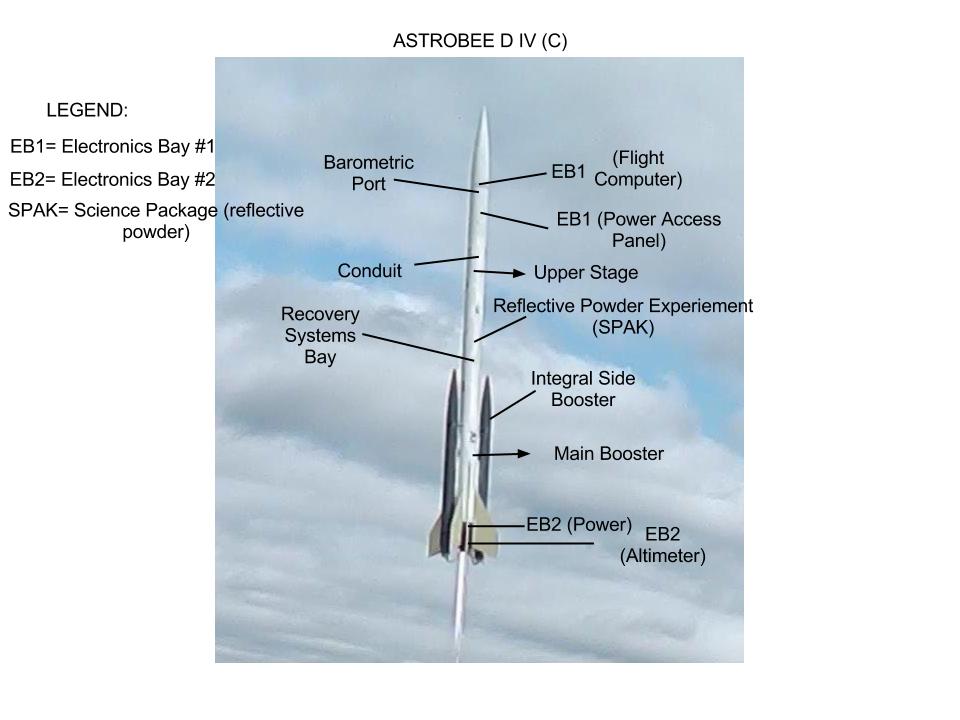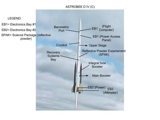 The Astrobee D IV (C) is the newest version (2013) of my Astrobee D series of rockets. Unlike the A and B rockets, the Astrobee D IV (C) will concentrate on performing scientific experiments in 2013 including releasing reflective powder in the atmosphere for making visual contact.