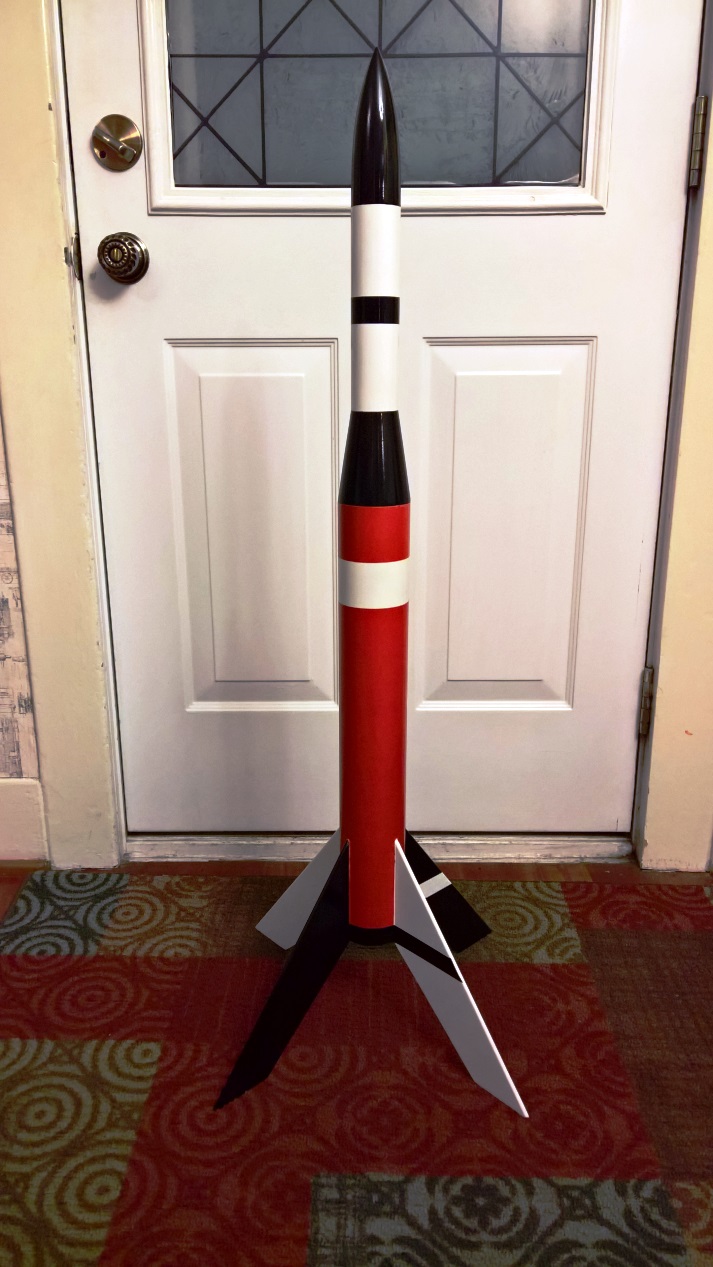What's better than a vintage style cluster rocket? One that's even bigger! I designed this upscale of an Astron Cobra to make use of three 29mm mounts, and (hopefully) Estes E16 & F15 motors. Lower body is made from Estes-sized 3" tube, and the payload section is 1.9" Aerotech. The nose cone and transition are upscaled balsa parts made by Sandman, and it uses a central baffle and a 30" thin-mil parachute. The paint scheme is inspired by the original Cobra livery, as well as by Delta rockets (with some roll pattern thrown in).