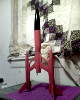 The Atheist Atom:BT55/56 balsa nose cone, a plastic tube adapter from a Estes Guardian; 35 cm 10 shroud parachutes all weighing in at 70g empty (no engine) (I still need to scratch decals.) In this design the tubes with the fins are far back behind the engine which makes this rocket stable (look at Space Ship One) The wings are made of bass wood 3/32 sanded to shape with 3/32 balsa laminations on each side of the root and tip making a wide root and keeping everything together. The engine hook is out side of the 24mm body tube wrapped with 24mm tube that was cut length wise to expanded around the body and a 18mm tube inside going all the way up through the transition into the BT55 tube. I finished it in pumpkin orange with a gloss black nose cone. This was not a fast scratch build (22 hours) haveing to think my way through the build process. B6-4 270ft C6-5 500ft Nice park flyer. NO! A'S