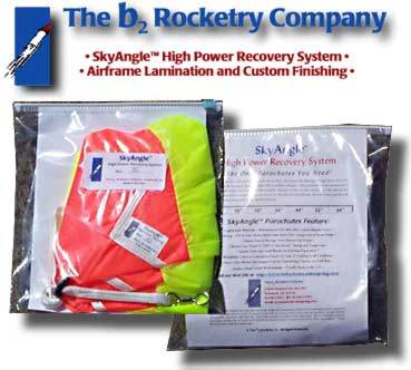 You should take a closer look at this company and their products. The "SkyAngle" is a great product and should be considered for your recovery system choiced. Available in six sizes, between 20" and 60", they are sure to have what you are looking for. For more information, check out their web site at http://b2rocketry.home.mindspring.com/index.html.