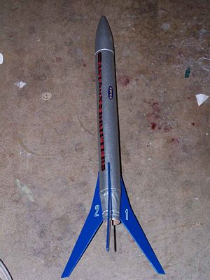 After a day to let the silver dry, I masked the body of the rocket leaving only the fins and the launch lug exposed. The rocket was then taken to the booth and sprayed with a bright blue. When it had started to harden a bit, it got another coat. The masking was then removed and the results inspected. As I mentioned before, the rocket was nowhere near perfect due to my own blunders, but I was satisfied.