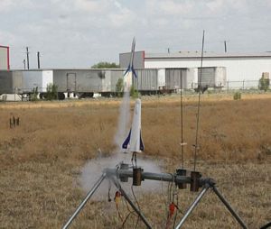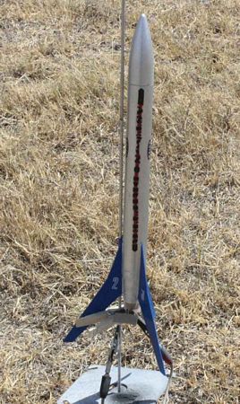 When the launch button was pushed, it shot up quickly flying straight and true. Ejection occurred while the rocket was still moving up at a pretty good clip but everything came out fine and it began its descent under a streamer. When I got to the rocket, I was glad to see that those long fins had not broken. It was fine to fly again.