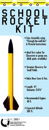 From the name, I infer that BMS intends this rocket to be used for school classes and other kids' groups. At $10 per rocket, it is perhaps a bit more expensive than some other choices. However, considering the incredibly simple assembly where the parts are marked and cut to virtually preclude mistakes, and considering the excellent flight characteristics, I would certainly recommend the BMS School Rocket for kids' organizations.
