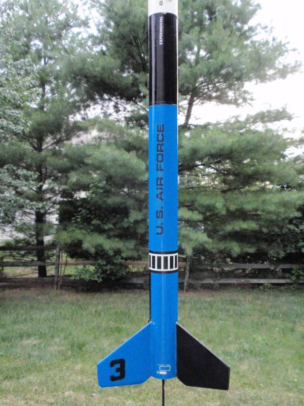 Bandit BoosterThis rocket featured ejection baffle tubes, designed to cool the gasses and trap burning particles before reaching the parachute, so no wadding was necessary. The parachute was stored aproximately in the black section of the rocket. The white section above was a seperate payload bay. |