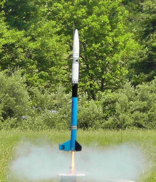 The modified payload bay of the old Estes Bandit is seen here. It is lengthened by about 4 inches to include the altimeter and a HD videocamera/recorder above that. The camera looks out the side window seen in the silver section just below the nose cone. It looks thru a shatter-resistant window that is mirrored to protect the camera from ultra-violet light.