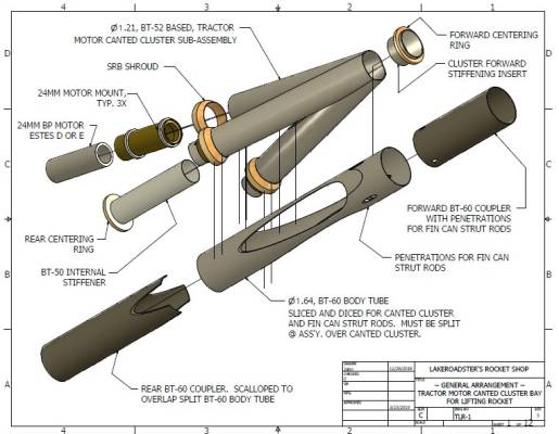 The upper three motor canted cluster utilizes a 24mm motor. There's a 24mm motor mount in the fin can, and the cargo bay too.