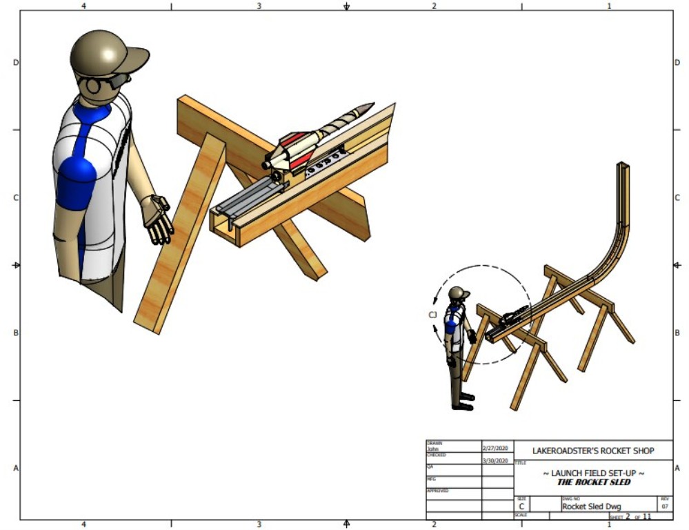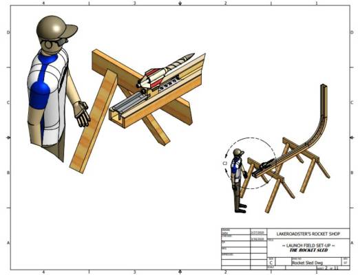 This design has an aluminum cart, call it a sled, that the rocket is lashed to. The sled runs inside a wooden track that is horizontal and then transitions via a curved section to a vertical orientation. Once the rocket / sled gets to the end of the track the rocket is cut free from the sled.