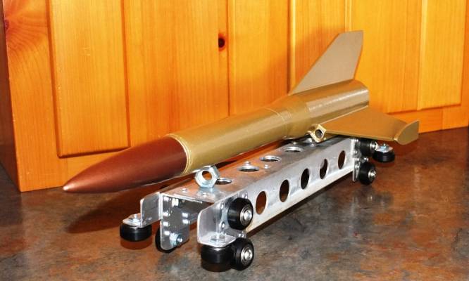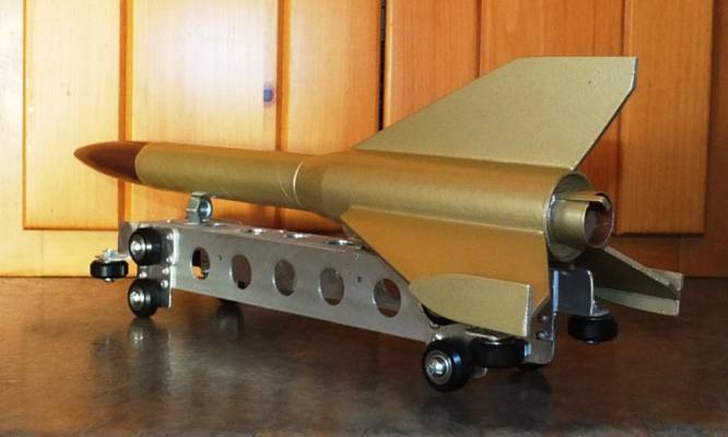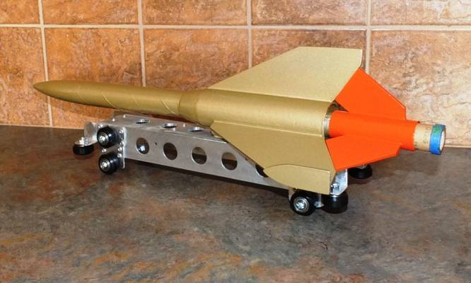 The rocket is built, as is the sled. I have not yet built the wooden track, nor has the rocket been launched.