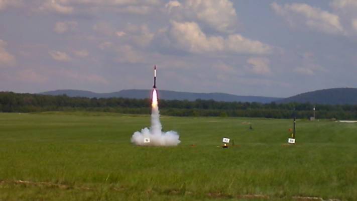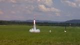 This rocket is a modified Madcow Super Batray. I added a payload section and an av bay to the rocket in order to make it dual deploy capable. The fins, the payload bay, and the leading edge of the aft body tube are all fiberglass reinforced. This rocket has a 38mm motor mount and has been flown on the new Aerotech J510W (second only to the Loki J1000LW). This rocket, weighing in at only 6 pounds with no motor, will haul butt when a full J is put into it.