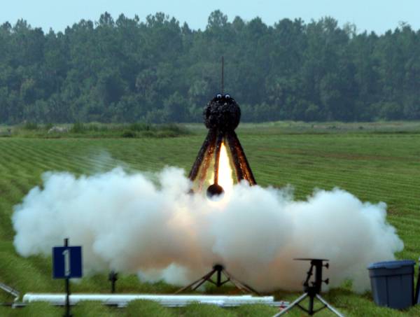 An Aerotech I284 "White Lightning" motor provides a spectacular display as it propels the Big Daddy Akavish into the skiy.